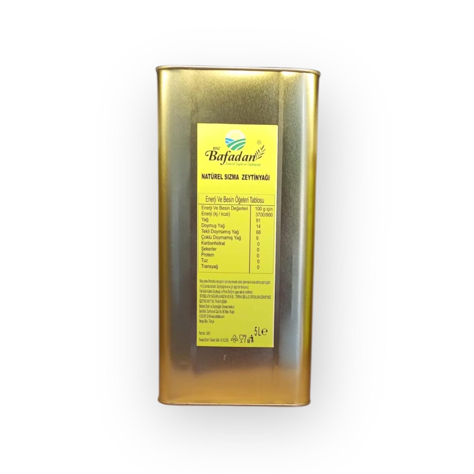 BNZ BAFADAN Natürel Sızma Zeytinyağı, 1845 yılından bu yana ailemize ait olan topraklardaki zeytinlerden soğuk sıkım (≤27°C) yöntemiyle elde edilir. Asit oranı %0,8’in altındadır, bu da üstün kalite ve düşük asitlik göstergesidir. Zeytinyağımız, hafif meyvemsi tadı, taze yeşil kokusu ve berrak altın sarısı rengiyle özellikle çiğ tüketim (salatalar, kahvaltılar, soslar) için idealdir. Hiçbir katkı ve koruyucu madde içermez, filtresiz ve %100 doğaldır.